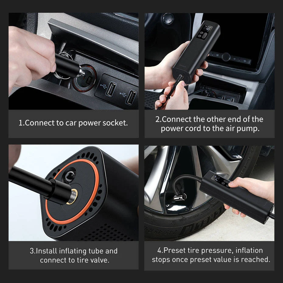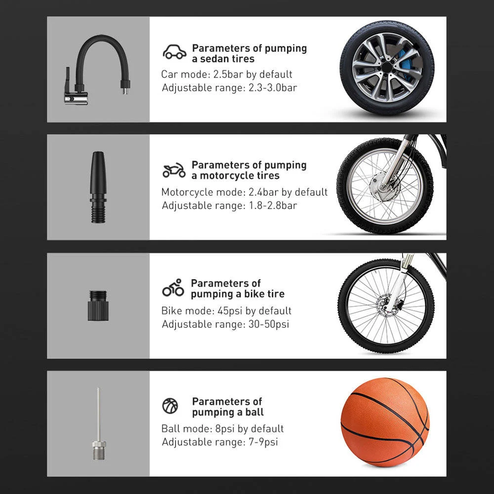 این کمپرسور با موتور قدرتمند خود توانایی پر کردن سریع لاستیک خودرو، موتورسیکلت و دوچرخه را دارد و علاوه بر آن میتواند برای توپها و تجهیزات ورزشی نیز استفاده شود.