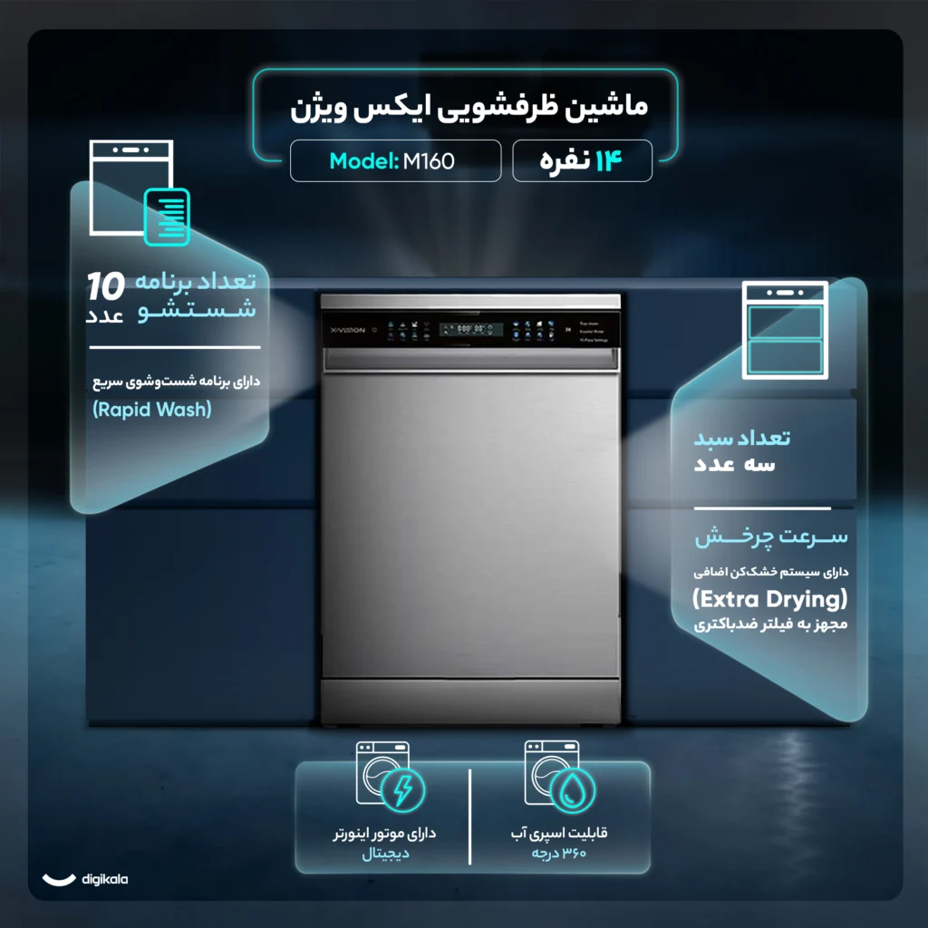 ماشین ظرفشویی ۱۴ نفره ایکسویژن مدل M160-S یکی از جدیدترین محصولات این برند ایرانی خوشنام است که با طراحی مدرن، مصرف بهینه انرژی و امکانات متنوع، تجربهای آسان و لذتبخش از شستوشوی ظروف را فراهم میکند. این مدل با ظرفیت ۱۴ نفره، برای خانوادههای پرجمعیت یا محیطهای کاری کوچک انتخابی ایدهآل محسوب میشود.