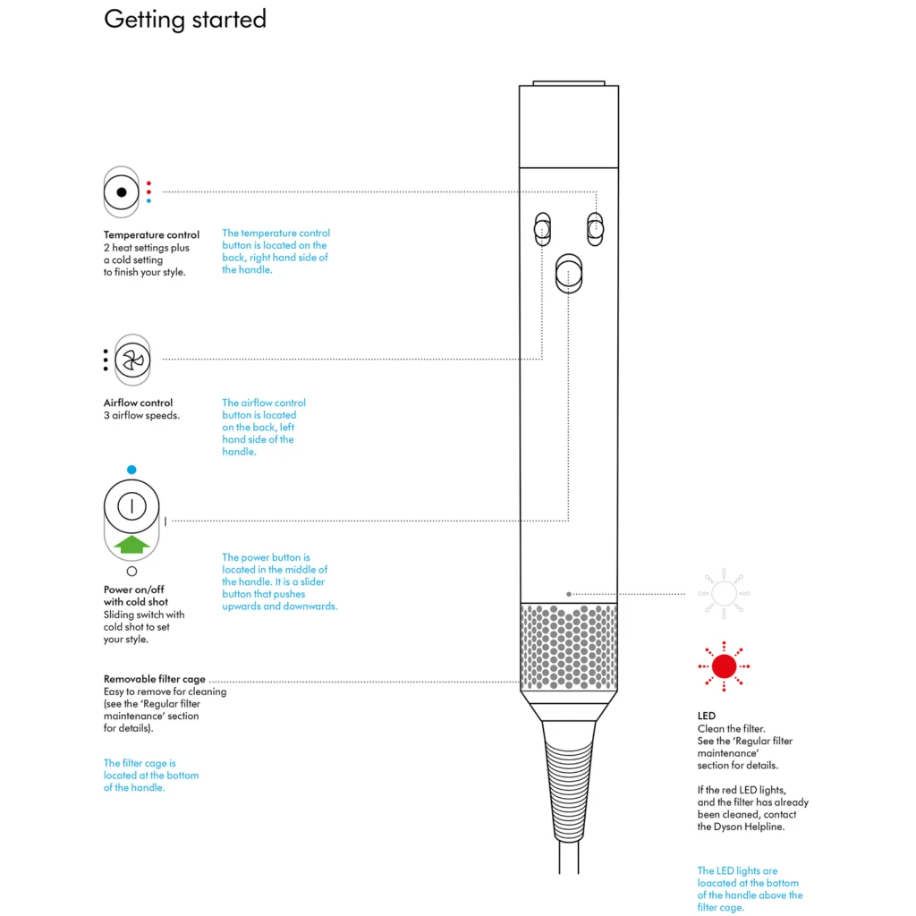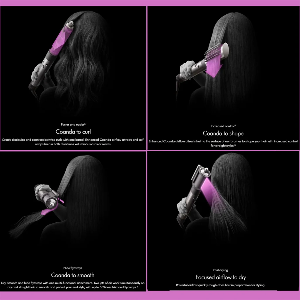 این سشوار از فناوریهای پیشرفتهٔ دایسون برای مدیریت جریان هوا و کنترل دقیق دما بهره میبرد که باعث میشود حتی موهای حساس، فر و مجعد بدون آسیب حرارتی شدید خشک و حالتدهی شوند. قابلیتهای خشککردن، حالتدهی و افزایش حجم مو با کمترین صدمات حرارتی در این مدل برجسته است و برای کاربران با موهای فر، پیچخورده، فرفری یا ضخیم طراحی شده است. فناوریهای پیچیدهٔ دایسون بهگونهای عمل میکنند که موها لطیف، براق و سالم باقی بمانند.