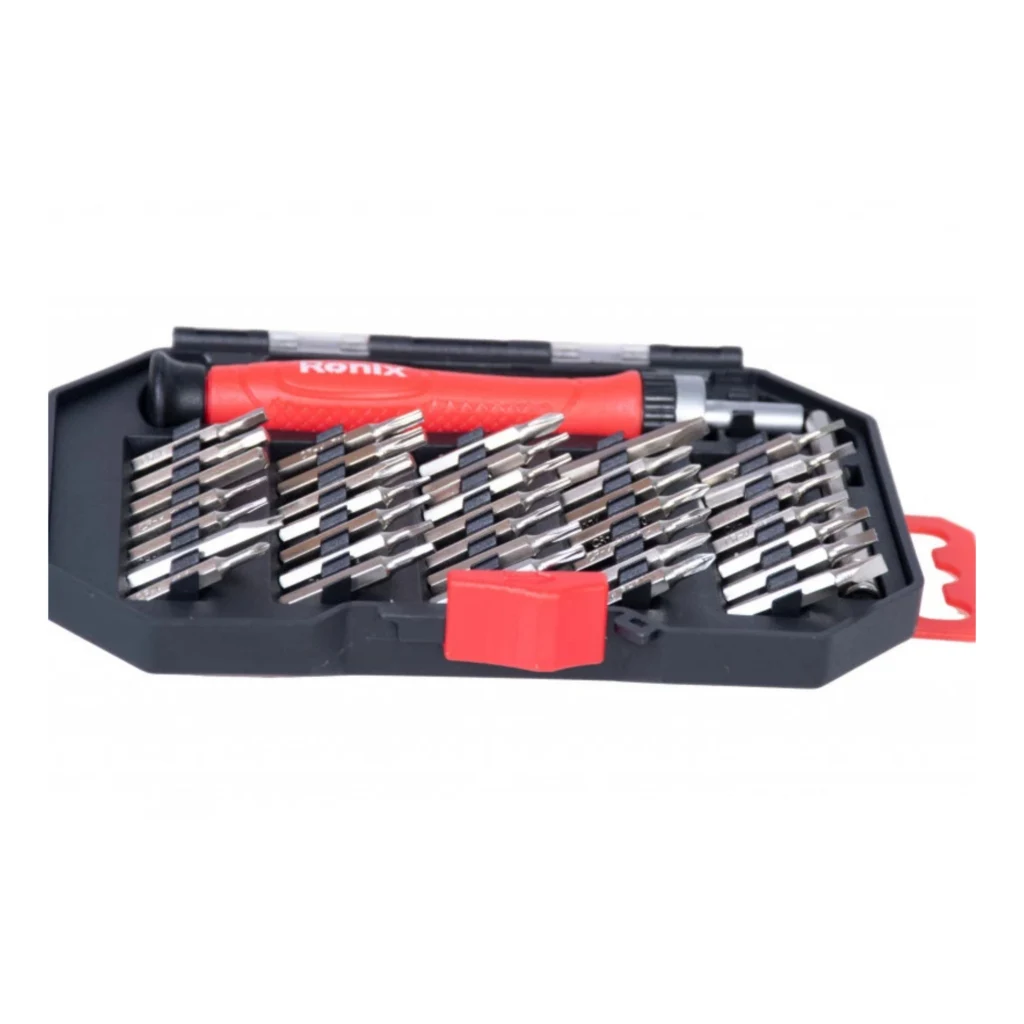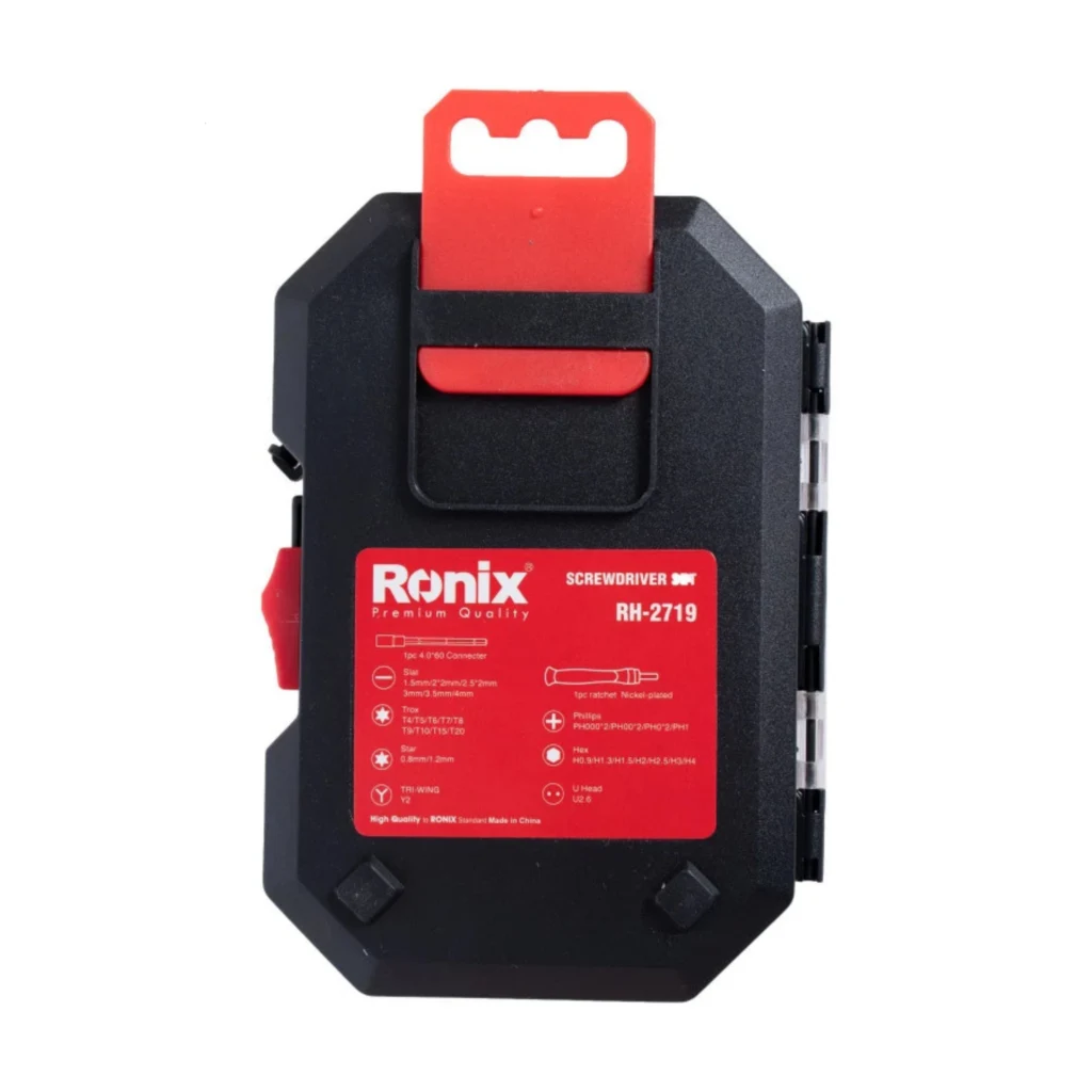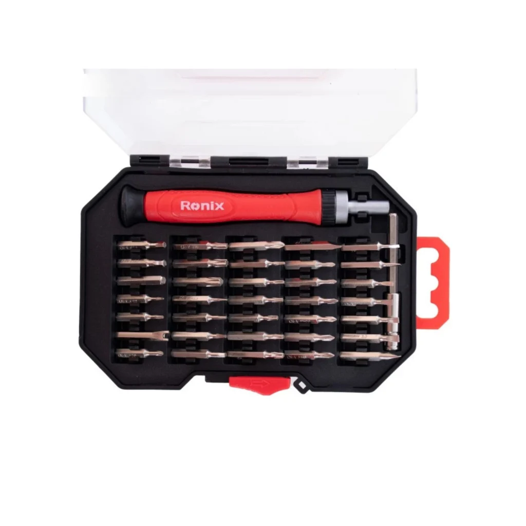 مجموعه RONIX RH-2719 با ۳۷ قطعه دقیق و حرفهای، بهترین همراه برای تعمیرات ظریف یا پروژههای فنی روزانه شماست. طراحی شده برای تعمیر موبایل، ساعت، لپتاپ و کارهای دقیق مکانیکی یا الکترونیکی.
